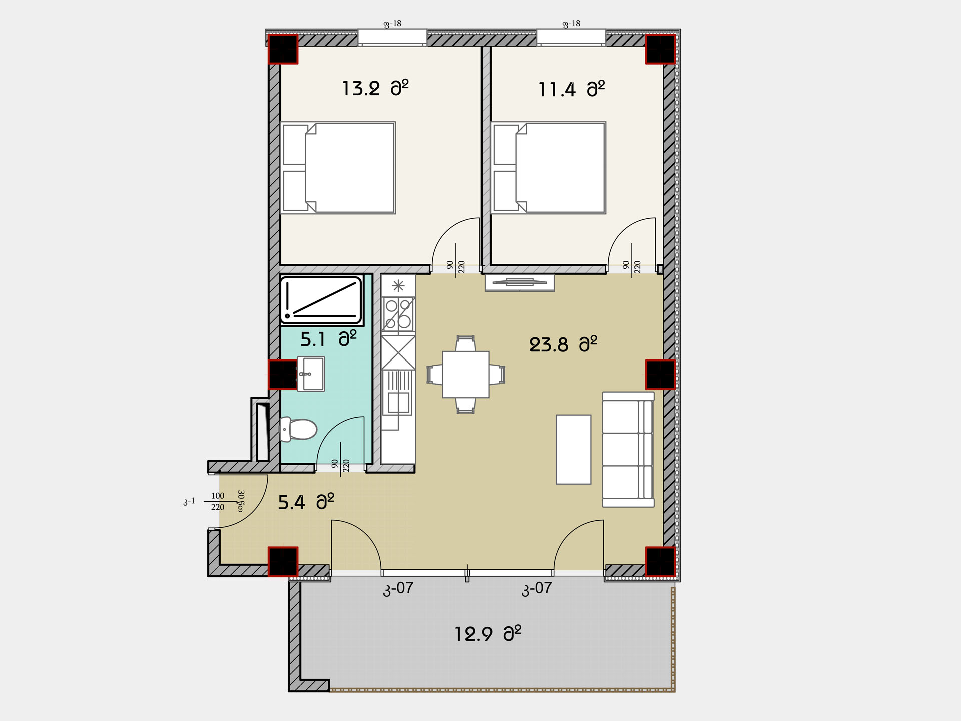 - საზაფხულო ფართი : 12.9 კვ.მ