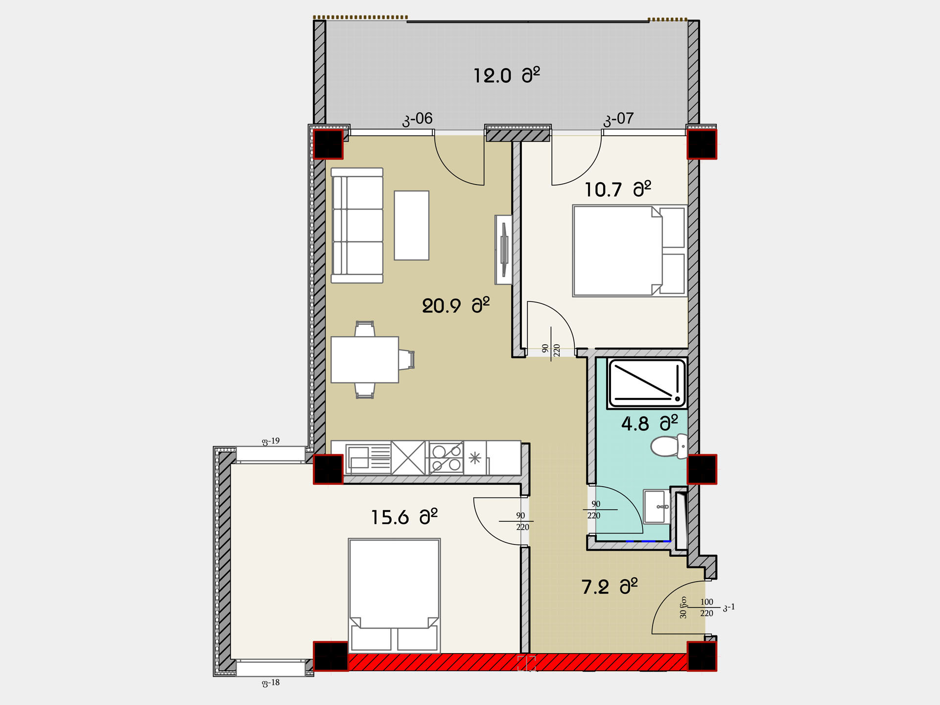 - საცხოვრებელი ფართი : 61.3 კვ.მ