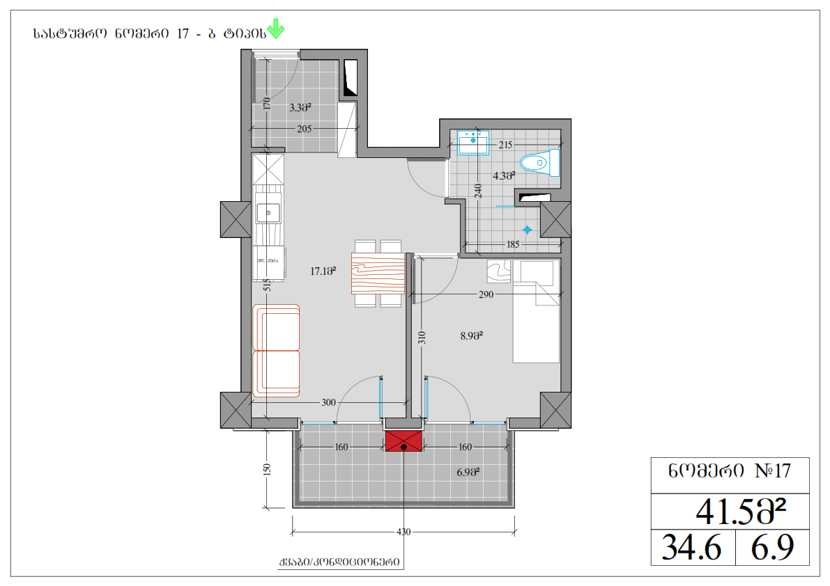 - საცხოვრებელი ფართი : 34.6 კვ.მ